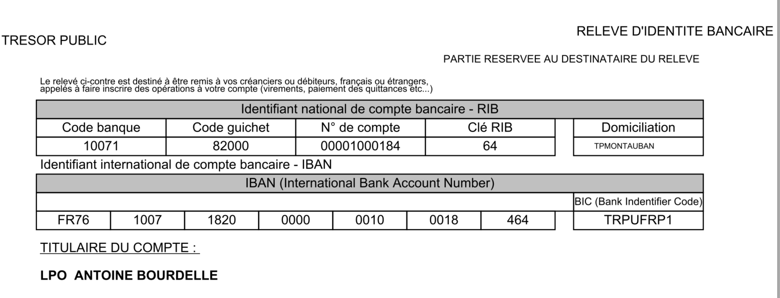- Par virement bancaire (minimum 41€) sur le compte du Lycée Bourdelle dont voici le RIB :